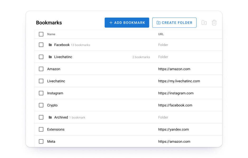 Group by niches, status and any other criteria. Use the layout, icons and color indication to quickly find browser profiles.